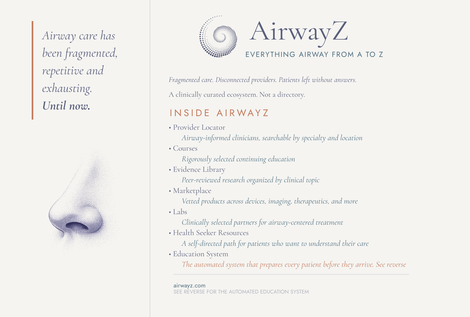 Before AirwayZ, navigating airway health often felt confusing and fragmented. Information was scattered across disciplines, resources were unvetted or outdated, evidence was difficult to find and even harder to trust, and forward thinking clinicians were isolated. For both providers and health seekers, simply figuring out where to start could feel overwhelming.
